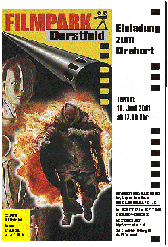 Dorstfelder Filmfestspiele:Familien Fuß, Krepper, Buse, Rösner, Schlierkamp; Schädel, Klein etc.Tel: 0231 174182, Fax: 171846Email.: info@fetenfest.deweitere Infos unter:http://www.fetenfest.deSet: Dorstfelder Hellweg 60 44149 Dortmund